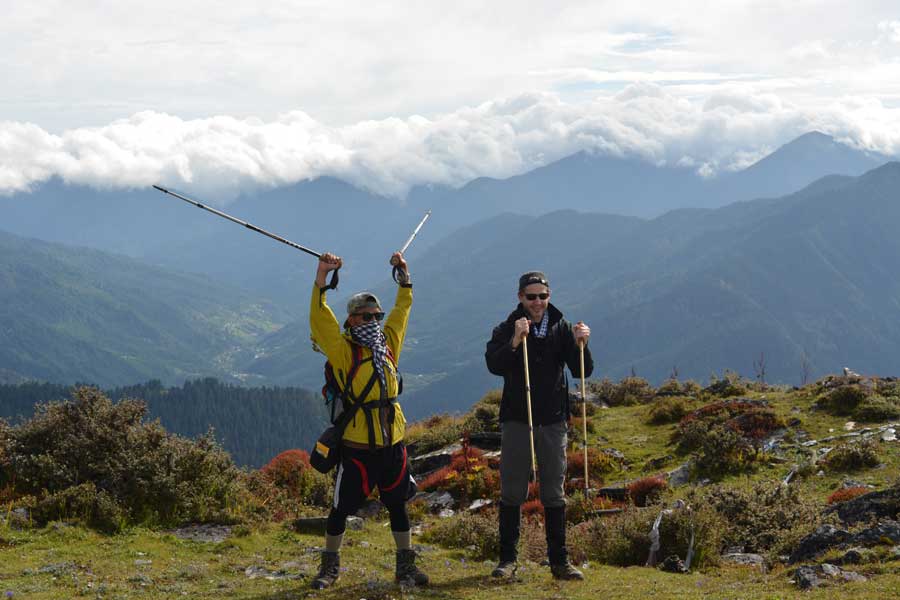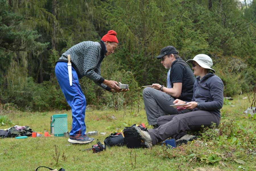 On a cloudless day one can see breathtaking panoramic views of Mount Jomolhari (the second highest peak in Bhutan) and Mount Kanchenjunga (the third highest peak in the world). The trail takes you through alpine meadows dotted with shrubs, flowers and through forest of pine, juniper and rhododendrons.